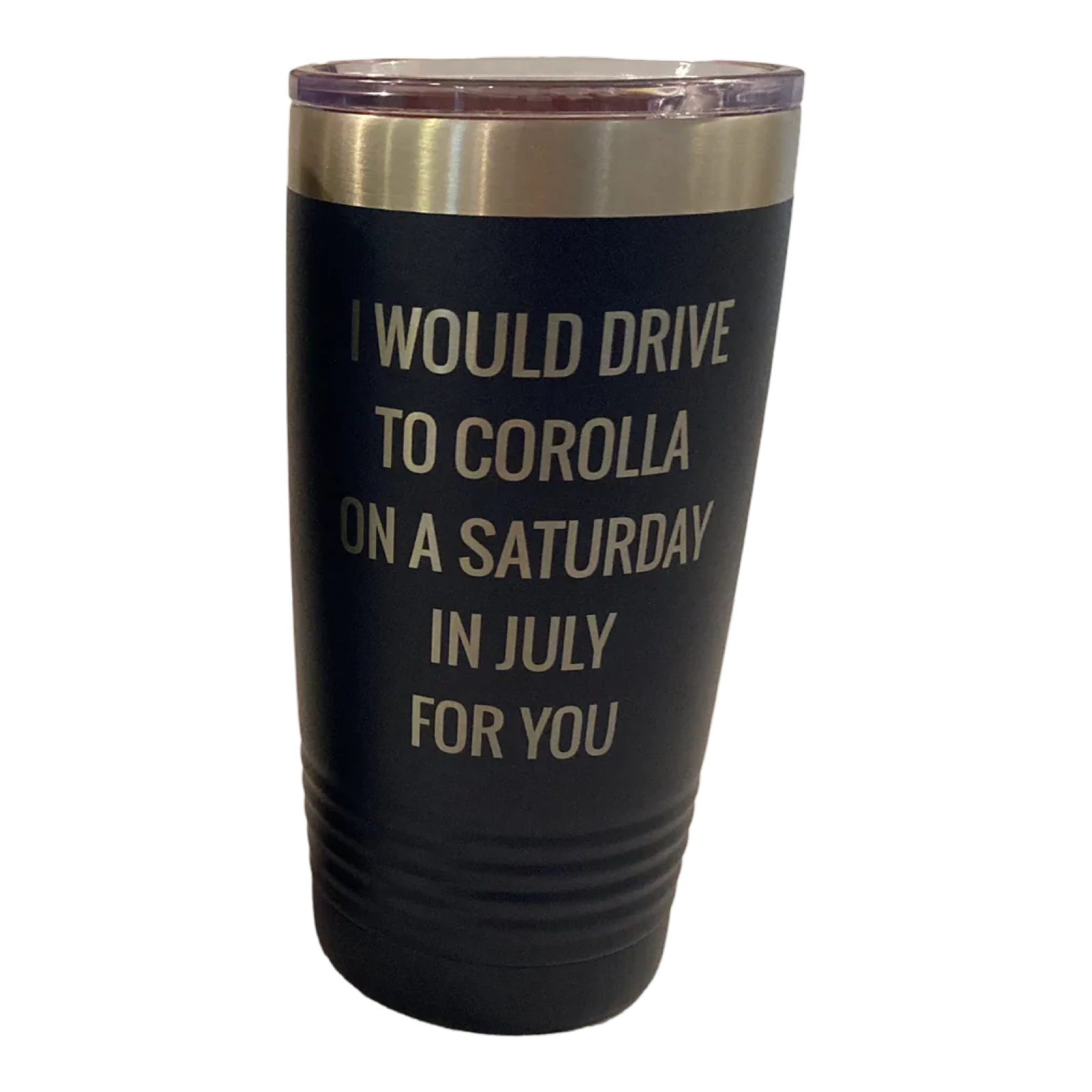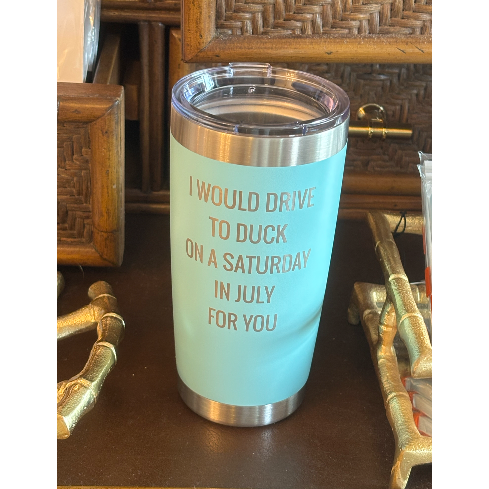 20 oz laser engraved tumbler. Corolla is navy color. Duck is light teal color.