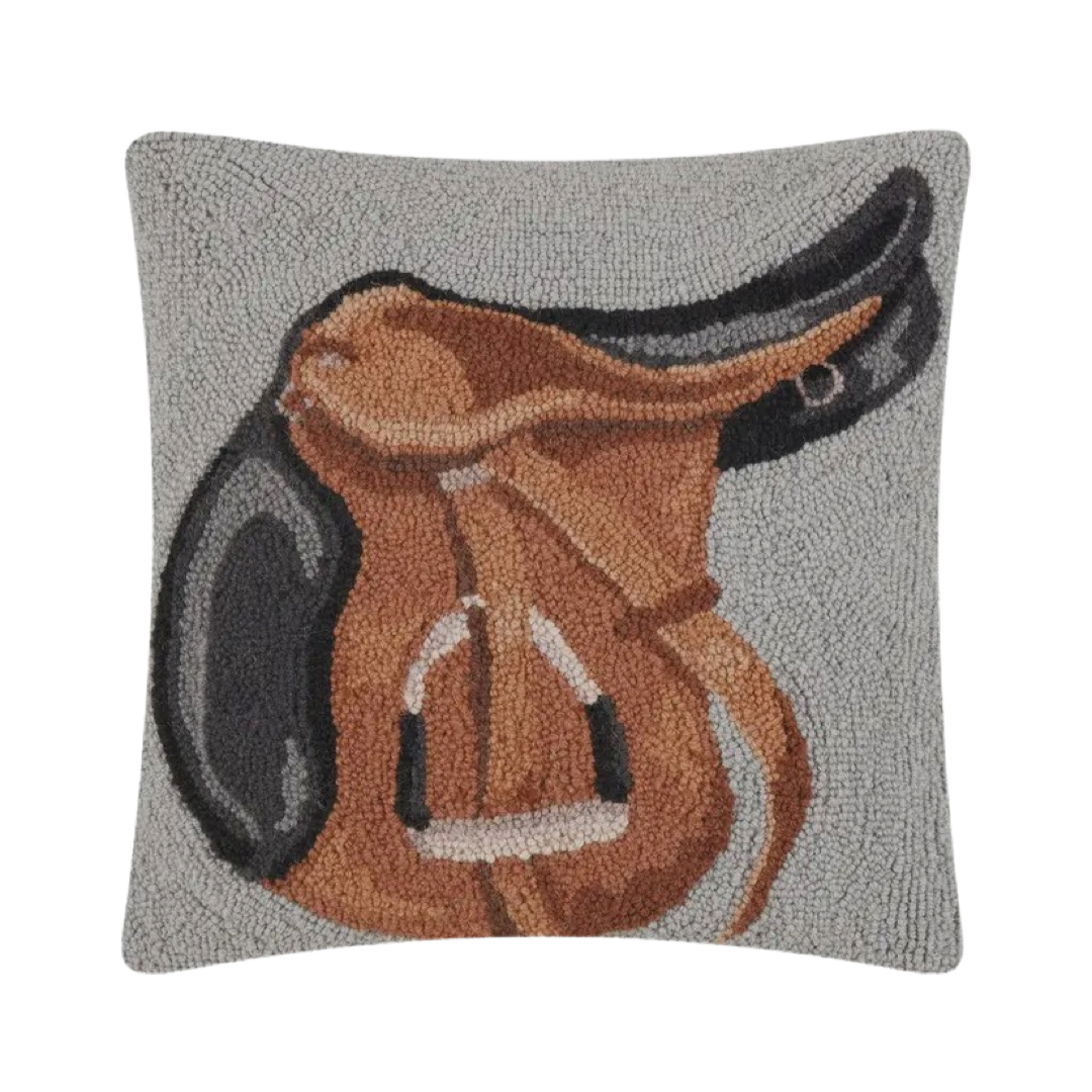 Hooked pillow features velveteen backing, zipper closure, and insert. Measures 18" x 18".