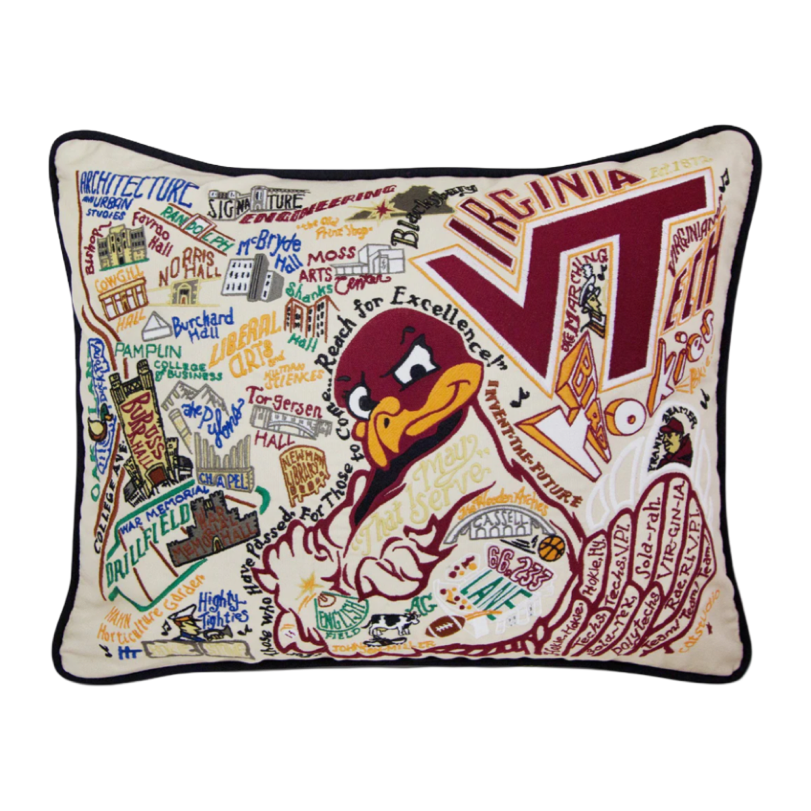 These special embroidered pillows measure 20" x 16" with zipper closure and insert included. Each design is initially hand drawn with collaborative input from a group of passionate alumni, fans, faculty, and locals to capture and illustrate the essence of the college. Each school is much more than a logo—it's an experience. With each purchase, $10-15 of the sale is donated back to the respective school, to fund scholarships, student activities, or recreational programs.