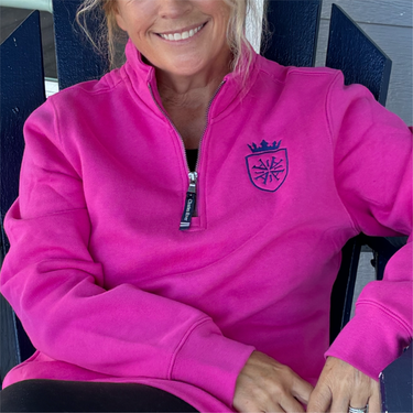 Sporting a nod to vintage blazer emblems, this cozy raspberry popover is perfect for chilly evenings around the fire pit or just lounging around the house. Featuring a traditional women’s fit with pockets and longer length. We recommend sizing up if you prefer your sweatshirts a little roomy.