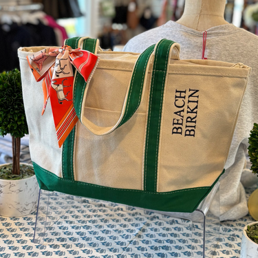 Thick 24 oz canvas tote with a cheeky attitude. Scarf not included. Measures 13” x 12” x 6” with top zipper closure. 14” handle drop. Interior organizational panel includes separate zipper and slip pockets.