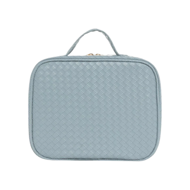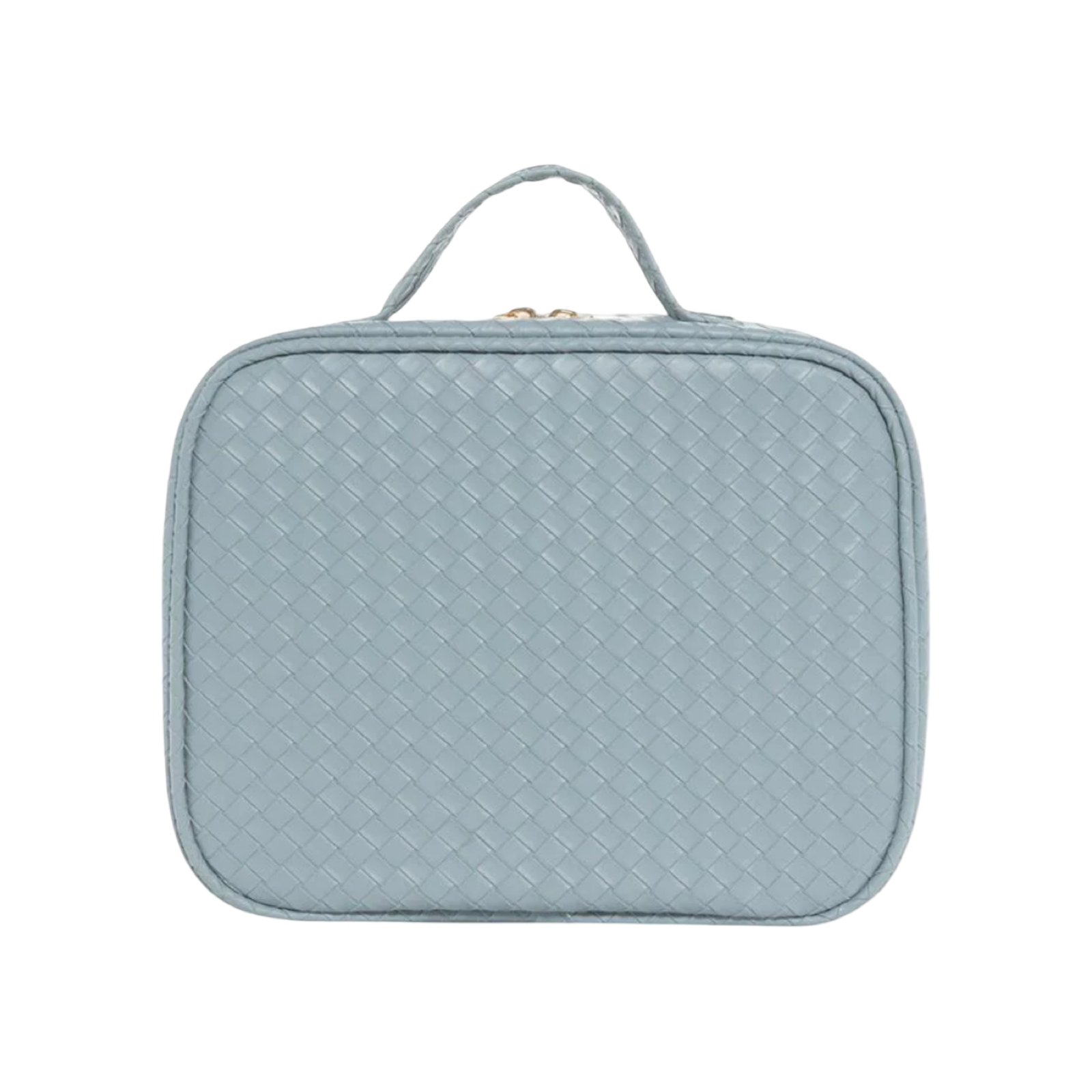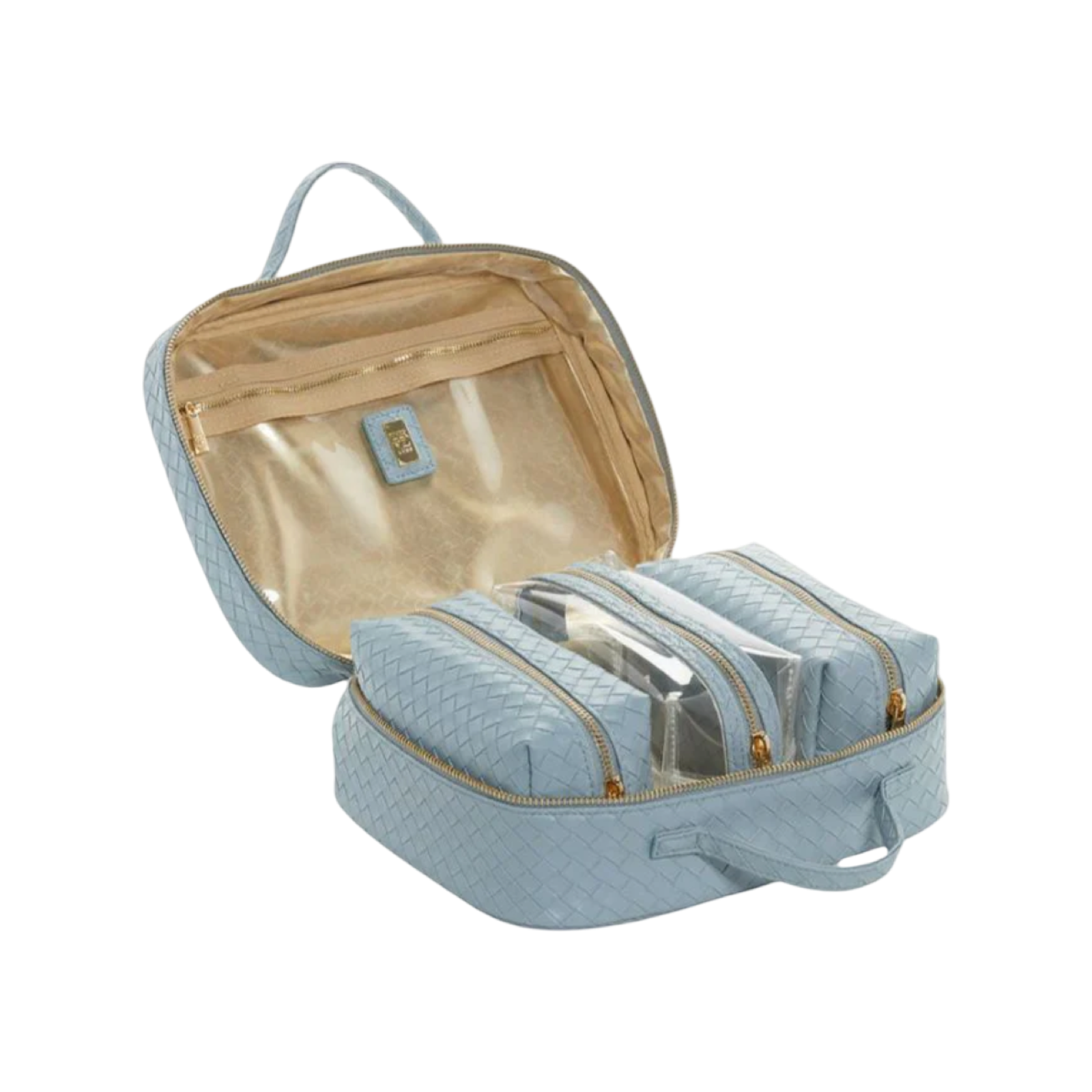 Featuring a large interior compartment with a zip pocket in the lid, a two-way zip around closure, 3 removable pouches inside, chic gold hardware, and a double top handle for grab and go travel. Lined in a coated and wipeable satin with 3 removable pouches (two matching leather and one in Eco-friendly clear) that can store your jewelry or beauty extras.
