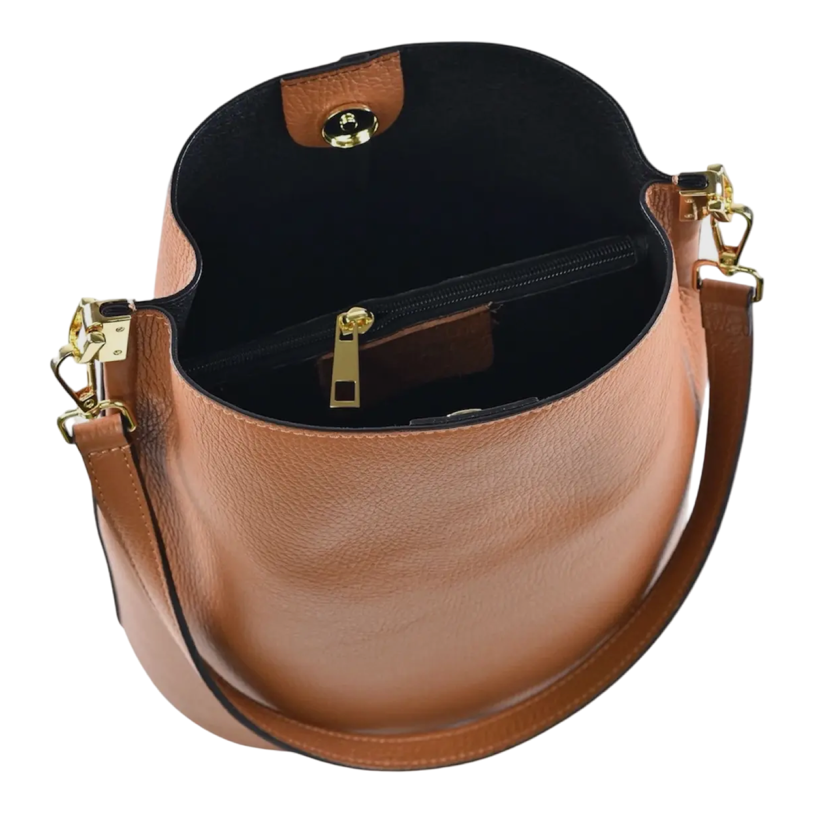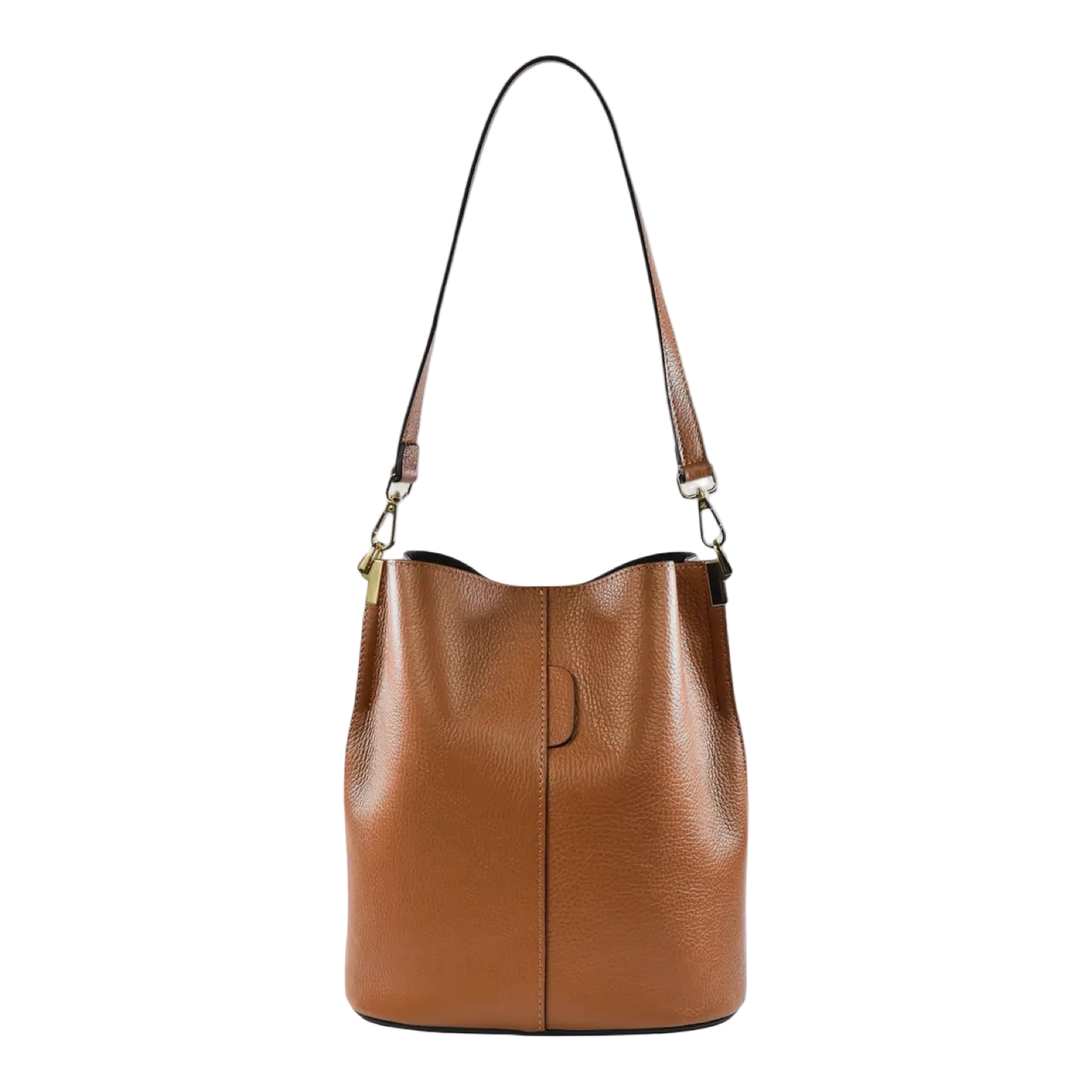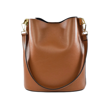 Flaunt your effortless style with this stunning leather bucket bag. Handcrafted in small batches of supple Italian leather. Measures 10.75" x 9" x 6". Gold hardware. Strap is the perfect length for over the shoulder wear. Bonus adjustable crossbody strap included.