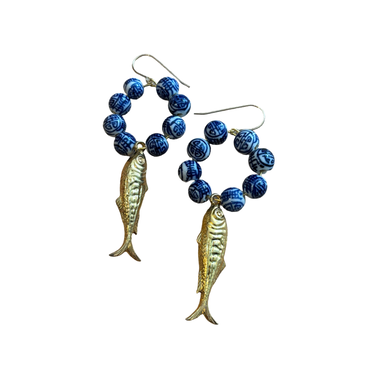 Artisanal earrings feature vintage German fish charms and hand painted porcelain chinoiserie beads. 14k plated earring wire. Earrings measure approximately 2.8”.