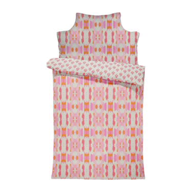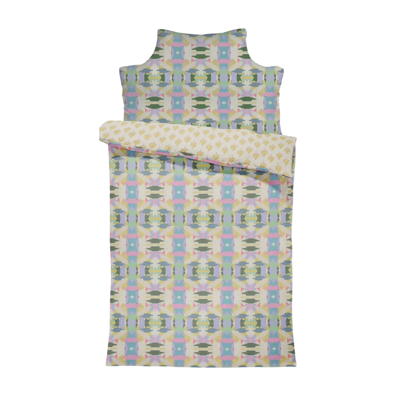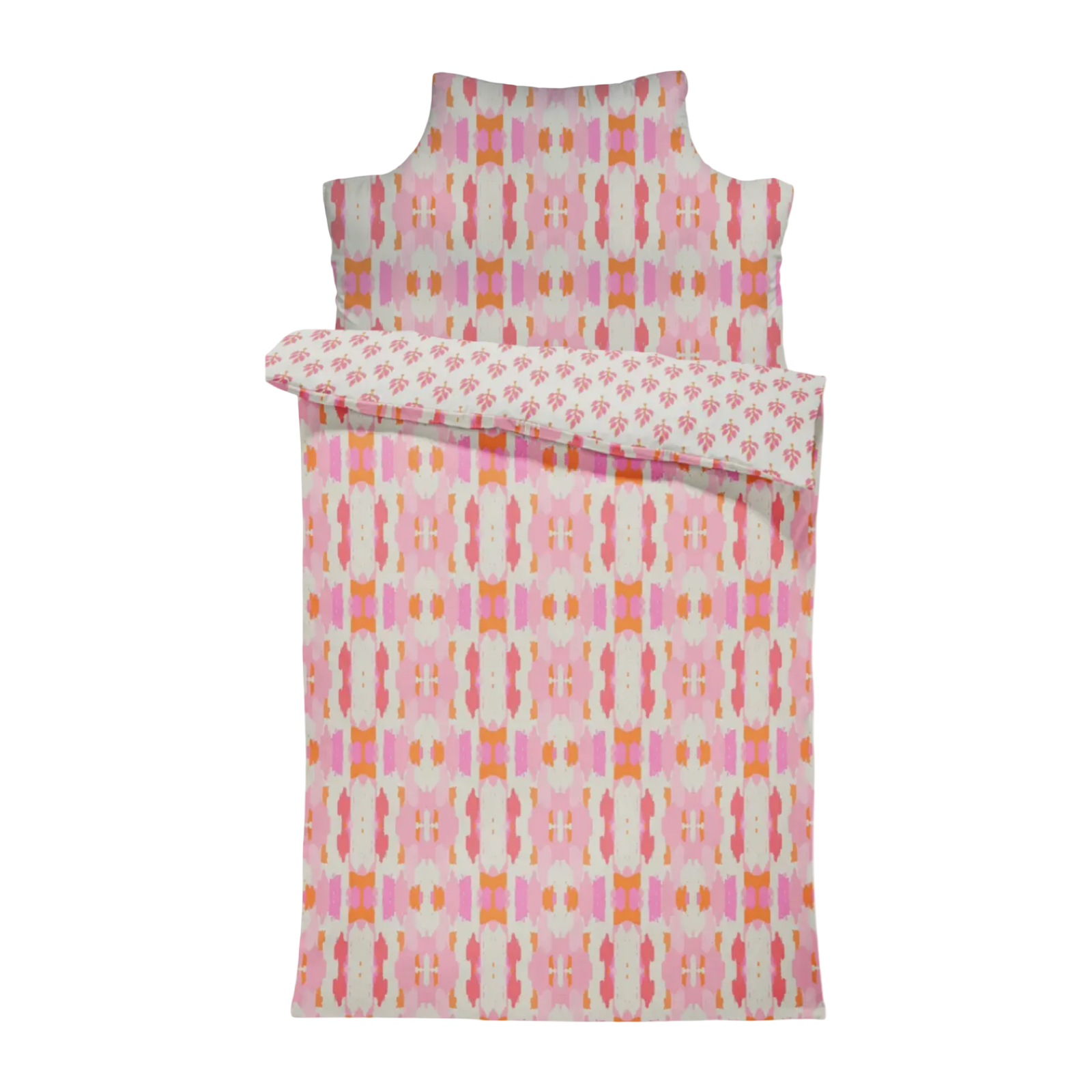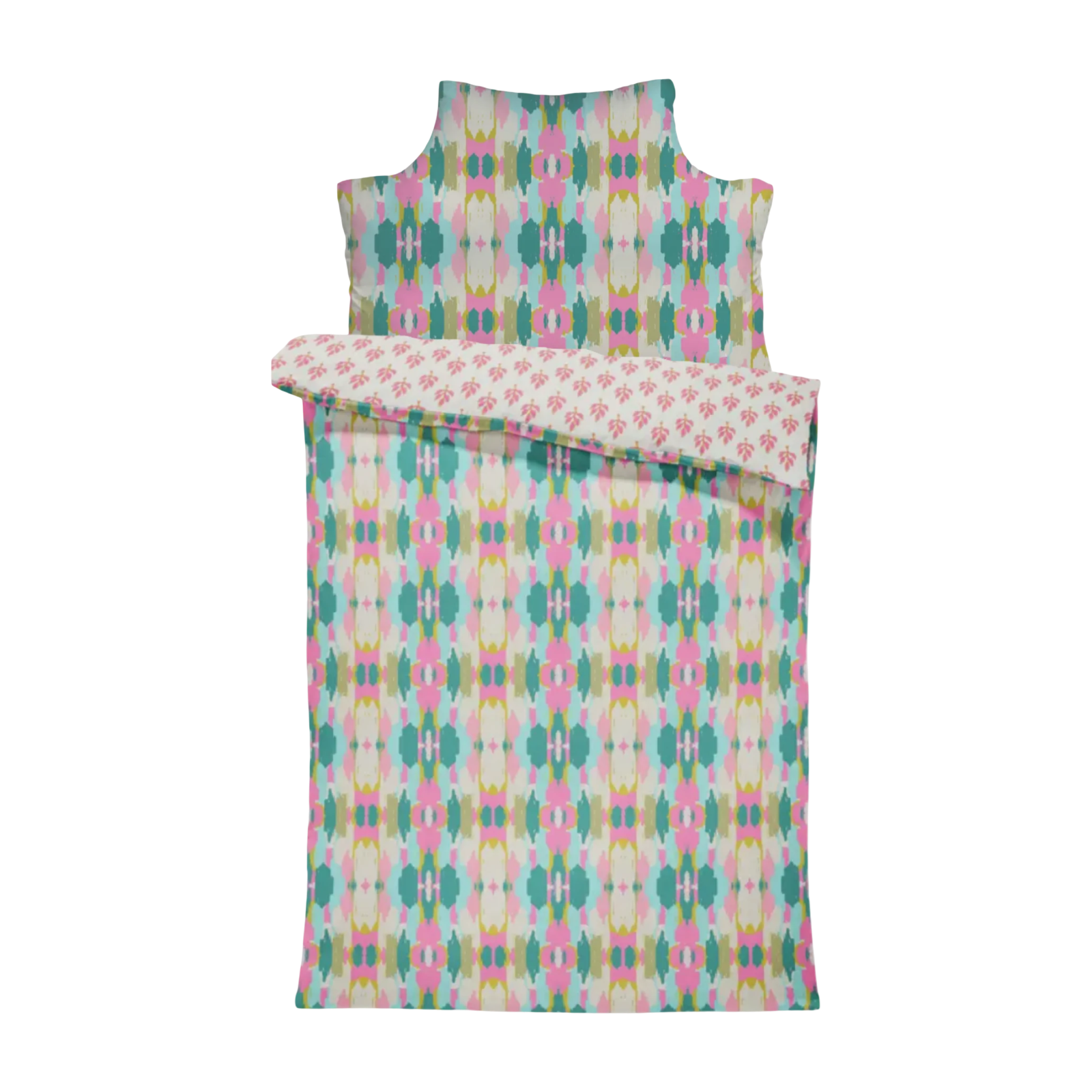 Luxe bedding set includes XL twin comforter with reverse block print pattern, standard pillowcase, euro sham, stuffed headboard pillow, and laundry bag. Hand blocked in India using sustainable fabrics and natural dyes.