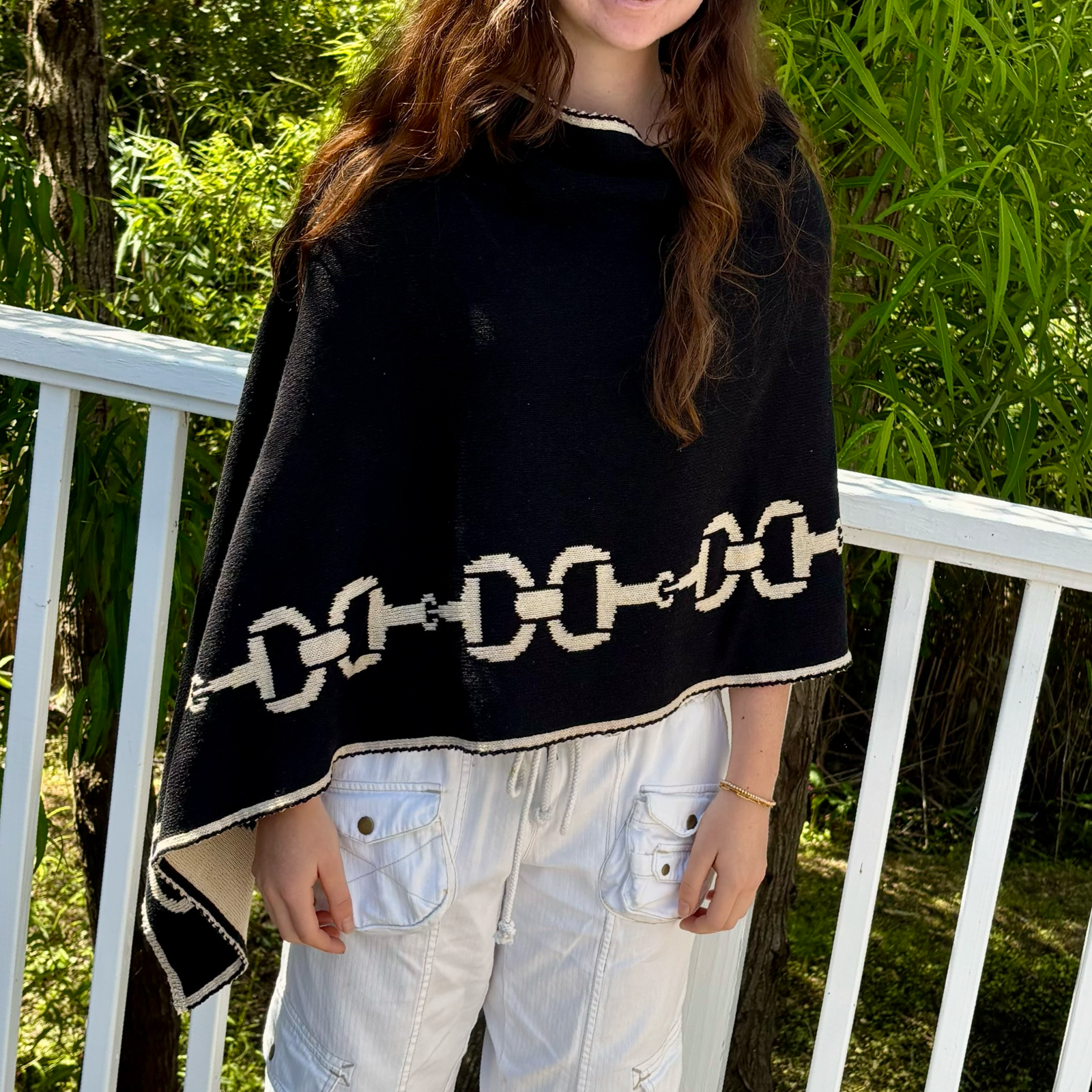 Our equestrian poncho combines sustainability with sophistication. Crafted with recycled fabrics, it features a refined horse bit detail. Ideal for layering and looks equally stunning with jeans or a dress and boots.