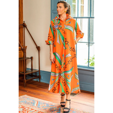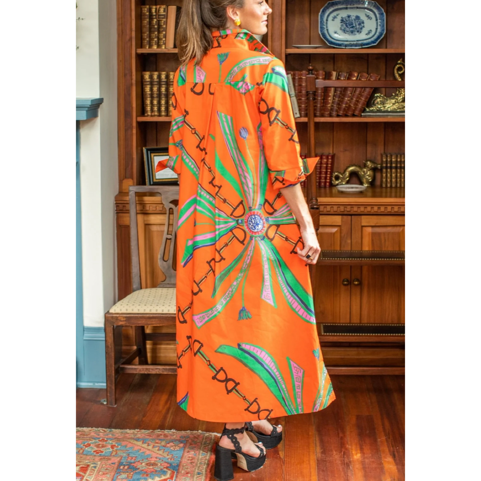 This stunning shirt dress is inspired by the luxe feel of a vintage, designer scarf. It is the perfect tone of orange to highlight a classic equestrian vibe, with ribbons of pink and green tied in blue. An original through and through.