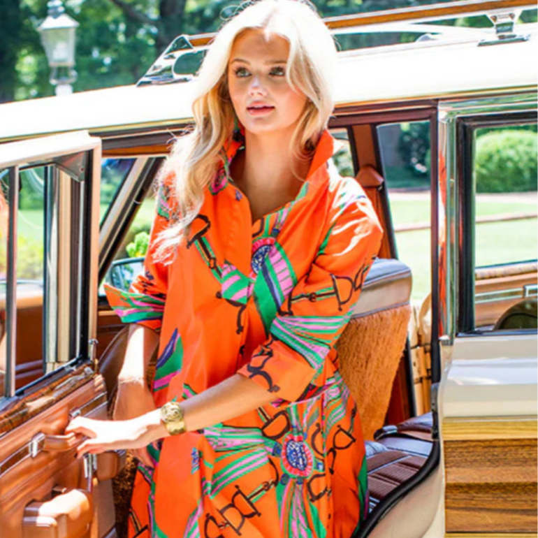 This stunning shirt dress is inspired by the luxe feel of a vintage, designer scarf. It is the perfect tone of orange to highlight a classic equestrian vibe, with ribbons of pink and green tied in blue. An original through and through.