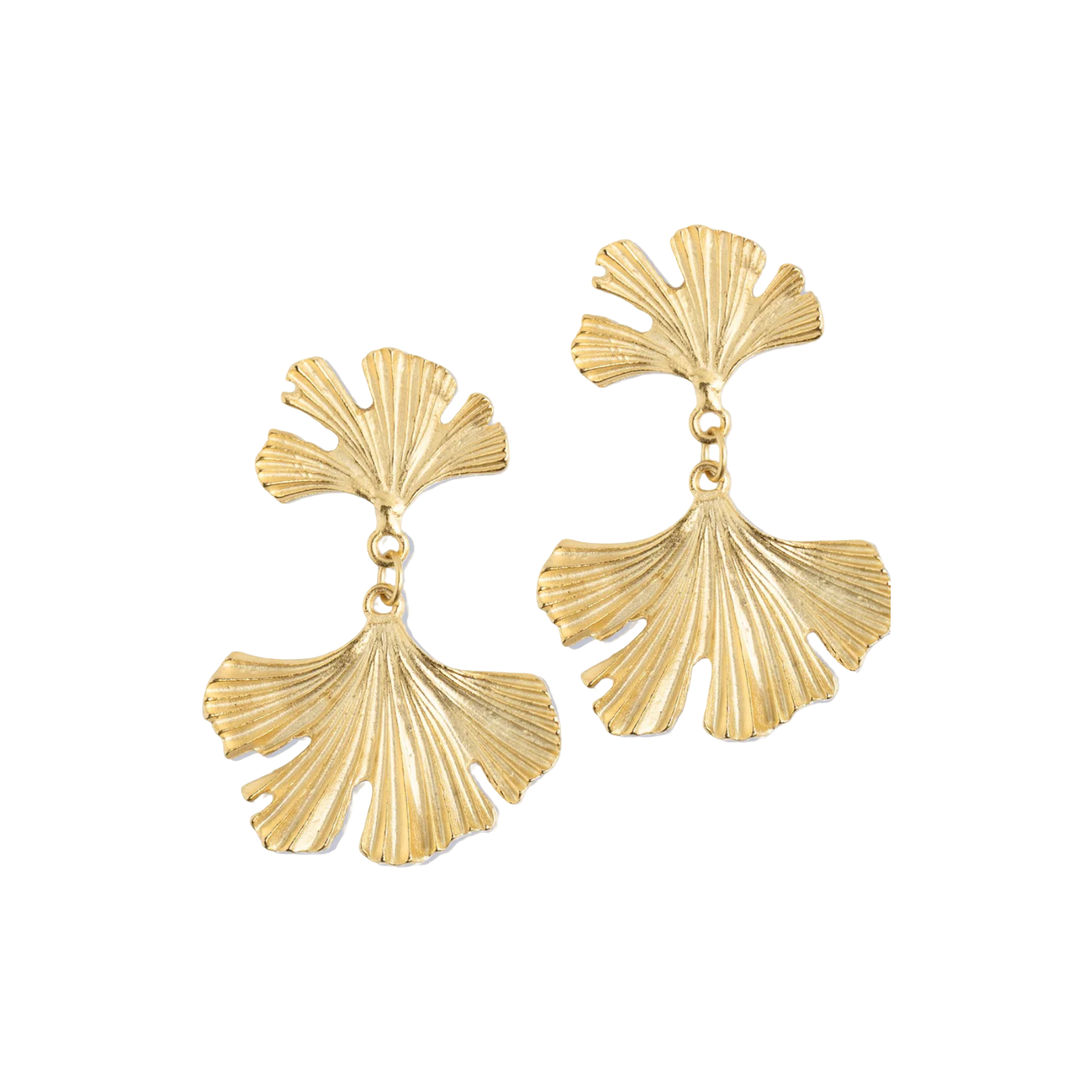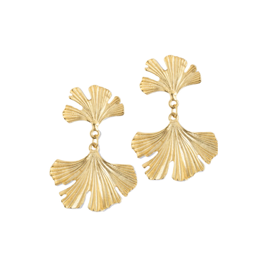 Brilliantly fanned out on top and bottom, our Ginkgo earrings replicate the ancient Ginkgo Biloba tree, a symbol of longevity and beauty. The stunning way in which the leaves are positioned to mirror each other, connected by a single gold ring, makes them uniquely flattering as they dance on your ears in the breeze. 2.25". Triple plated 24k gold. Handmade in the USA.