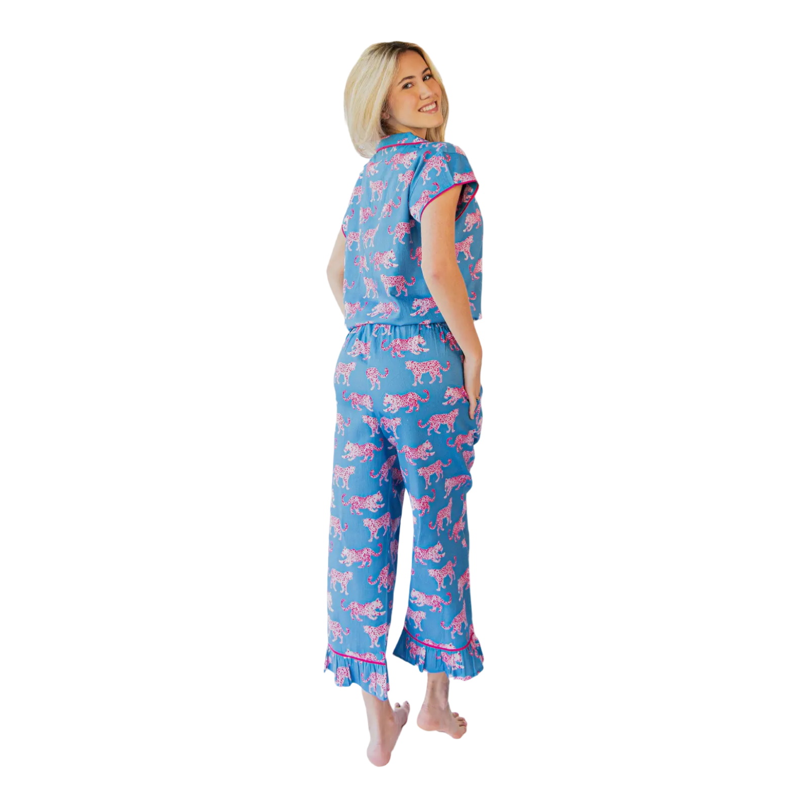 Light and airy luxe pajama set is 100% cotton. Capri length pant. Made in India.