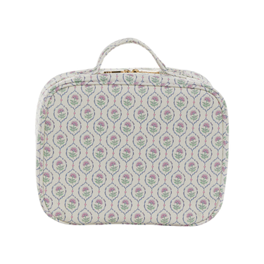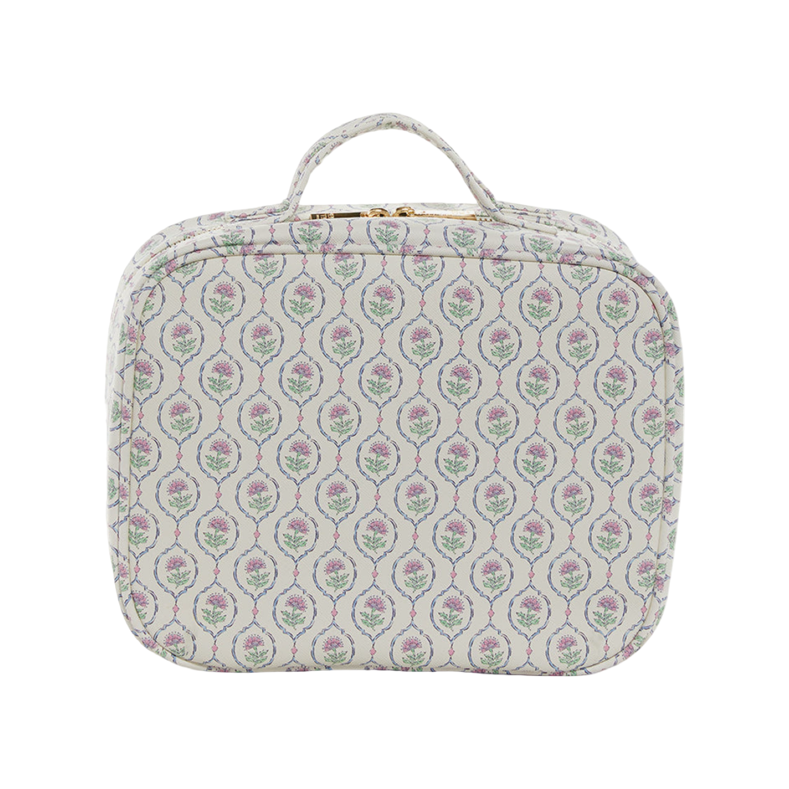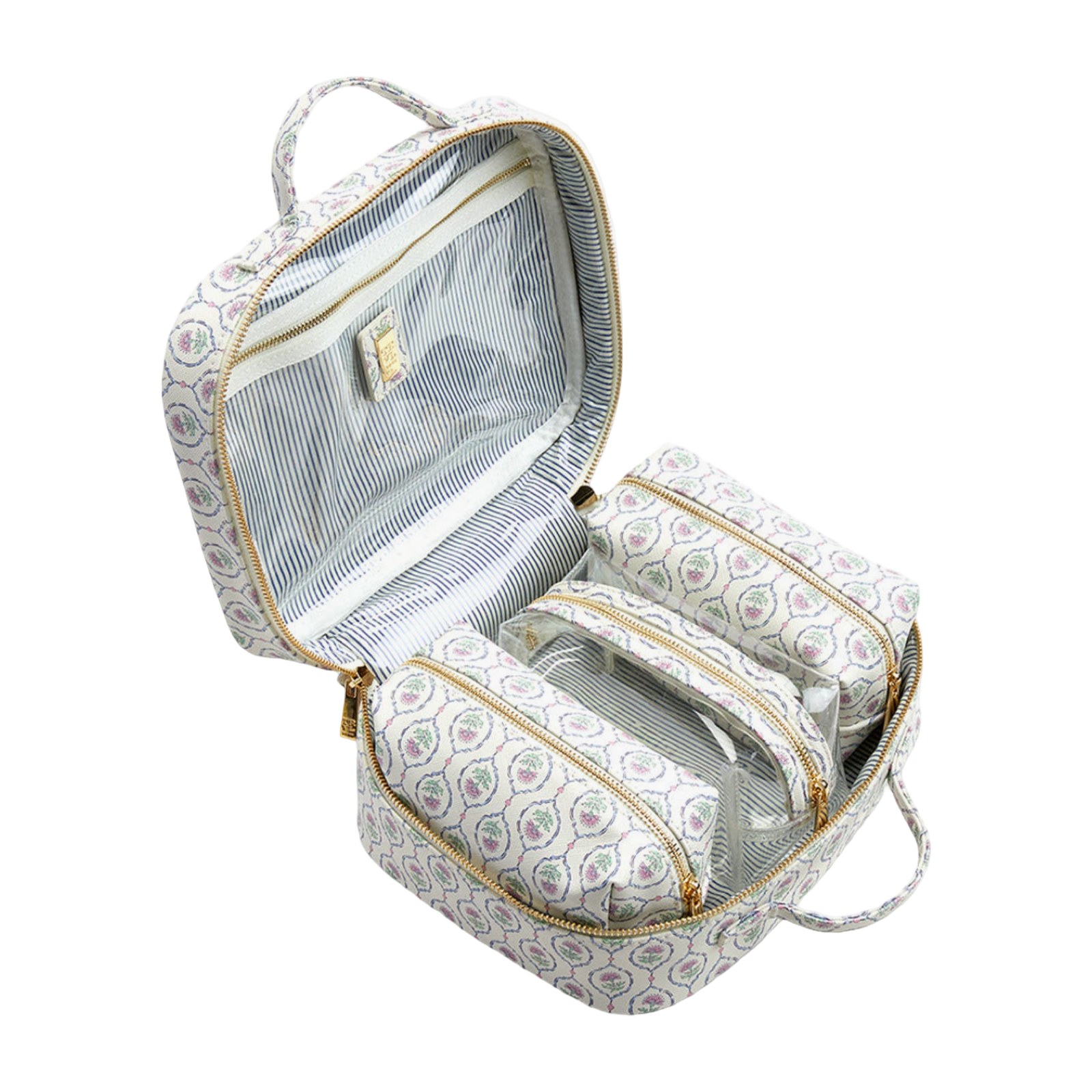 Featuring a large interior compartment with a zip pocket in the lid, a two-way zip around closure, 3 removable pouches inside, chic gold hardware, and a double top handle for grab and go travel. Lined in a coated and wipeable satin with 3 removable pouches (two matching leather and one in Eco-friendly clear) that can store your jewelry or beauty extras.