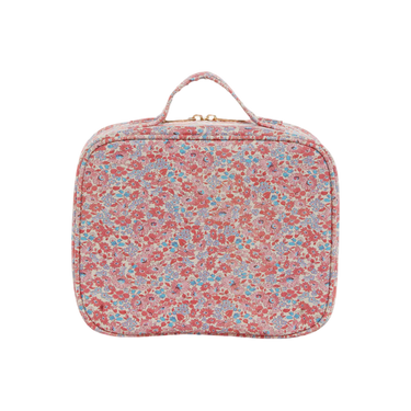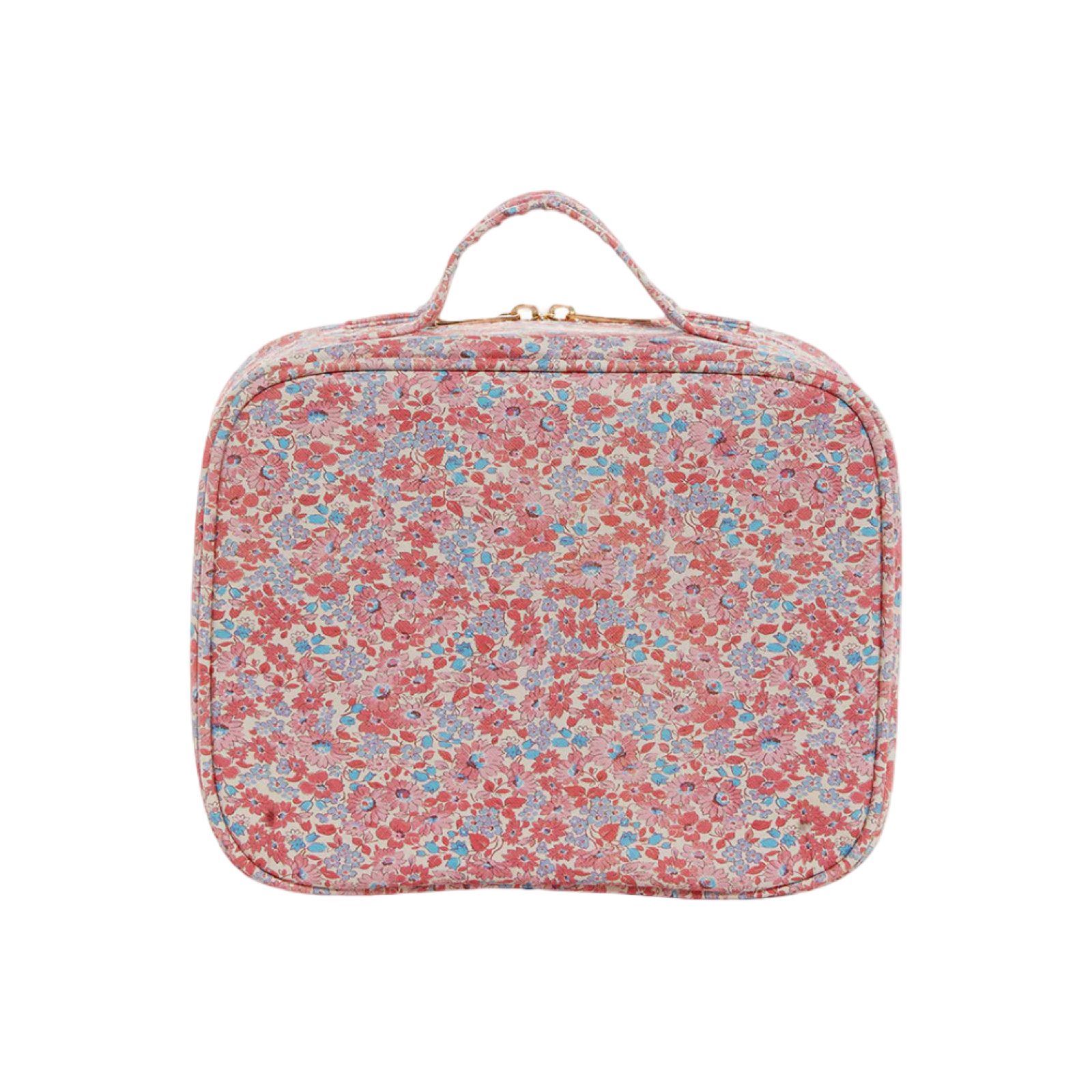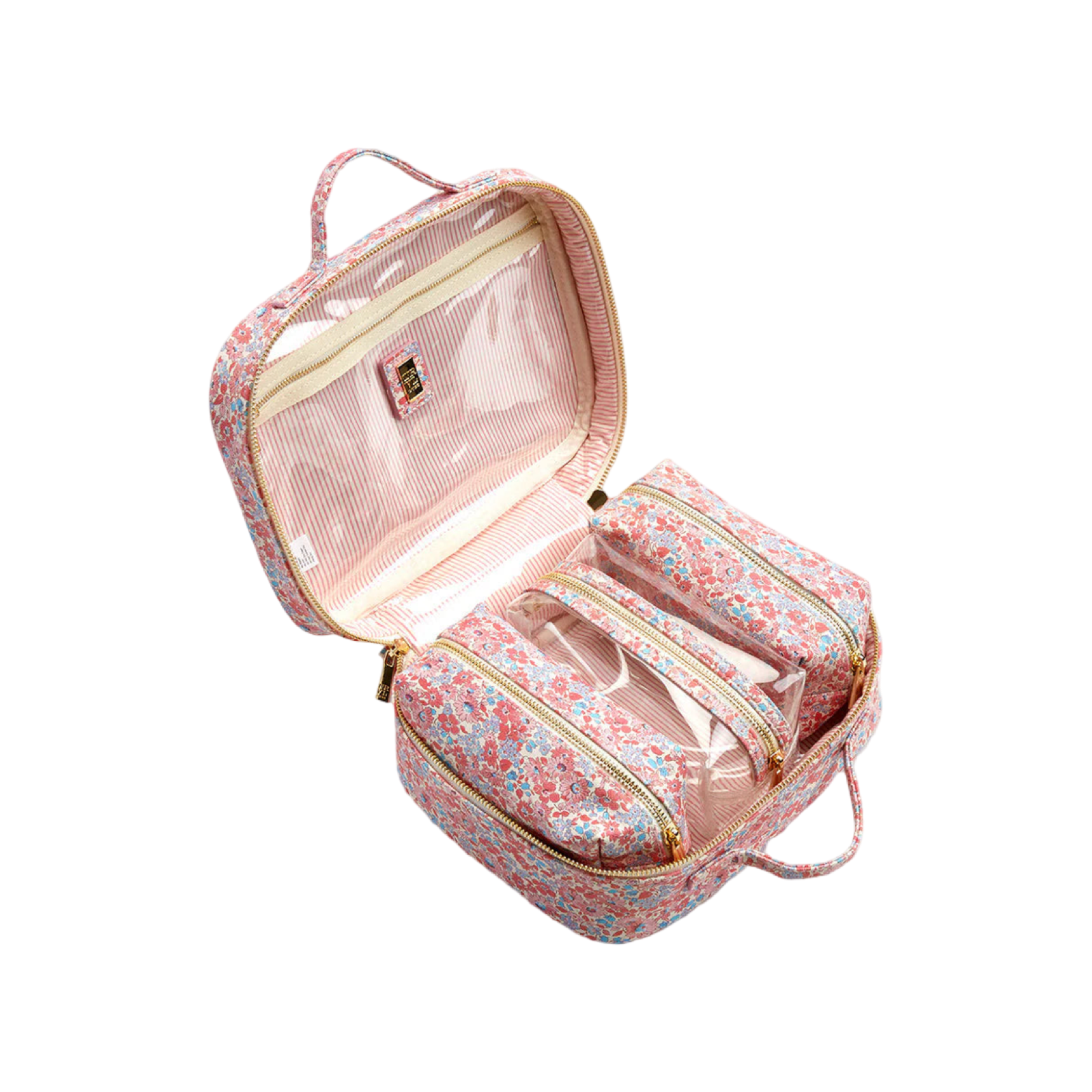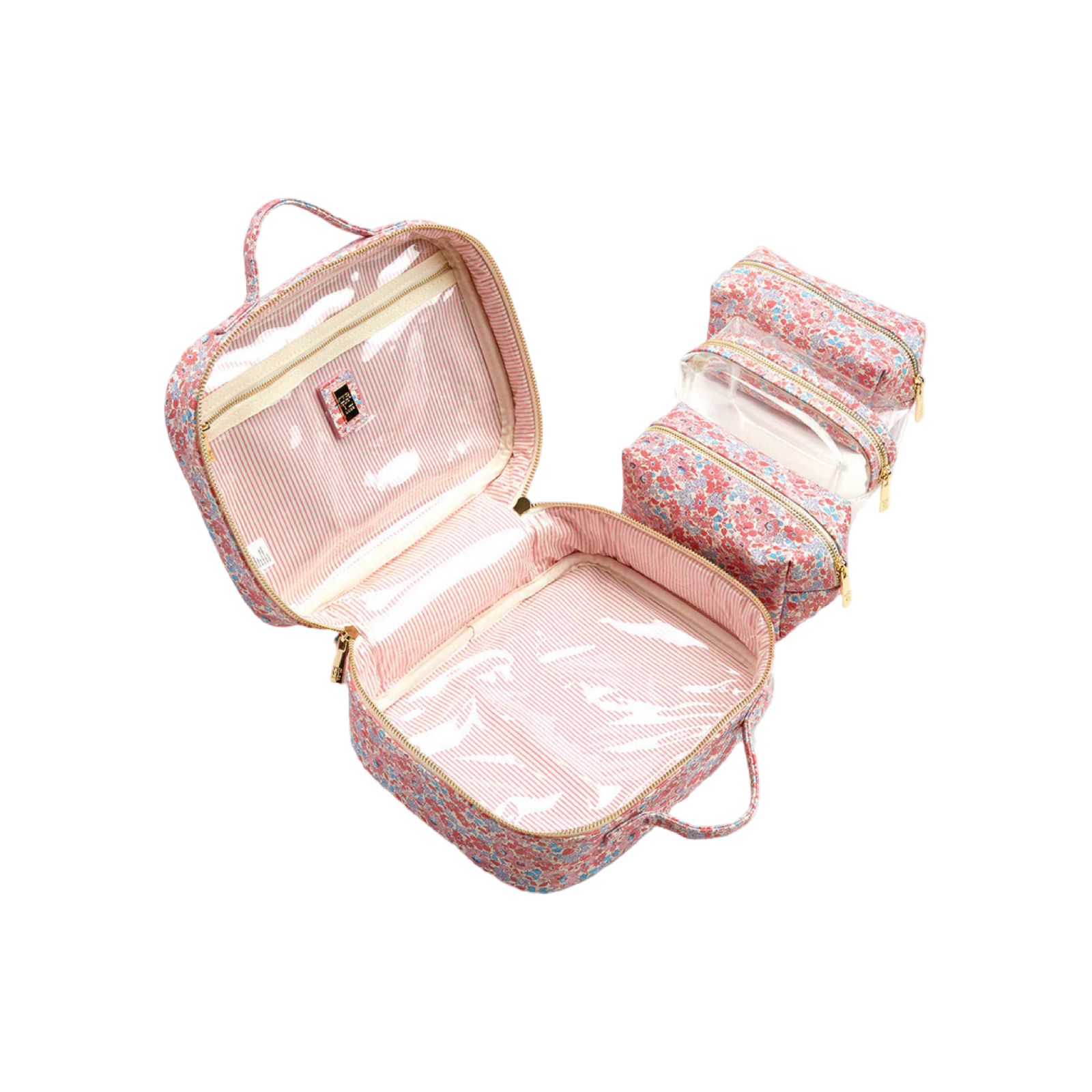 Featuring a large interior compartment with a zip pocket in the lid, a two-way zip around closure, 3 removable pouches inside, chic gold hardware, and a double top handle for grab and go travel. Lined in a coated and wipeable satin with 3 removable pouches (two matching leather and one in Eco-friendly clear) that can store your jewelry or beauty extras.