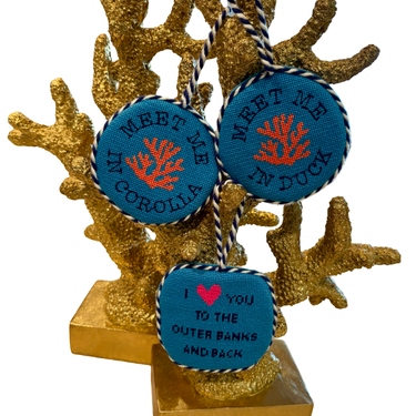When we designed these small batch, handcrafted ornaments, we chose thread hues reminiscent of the ocean and sky on a perfect beach day. Finished with a cerulean blue velveteen backing, our ornaments make a thoughtful hostess gift. Hang them on your tree as a reminder of your Outer Banks vacation, or from a bow as a colorful finishing touch on a gift.