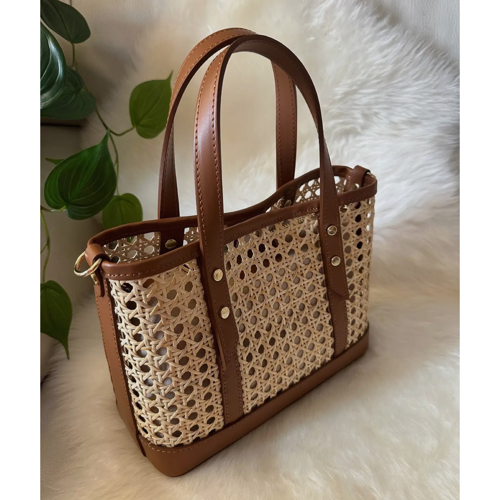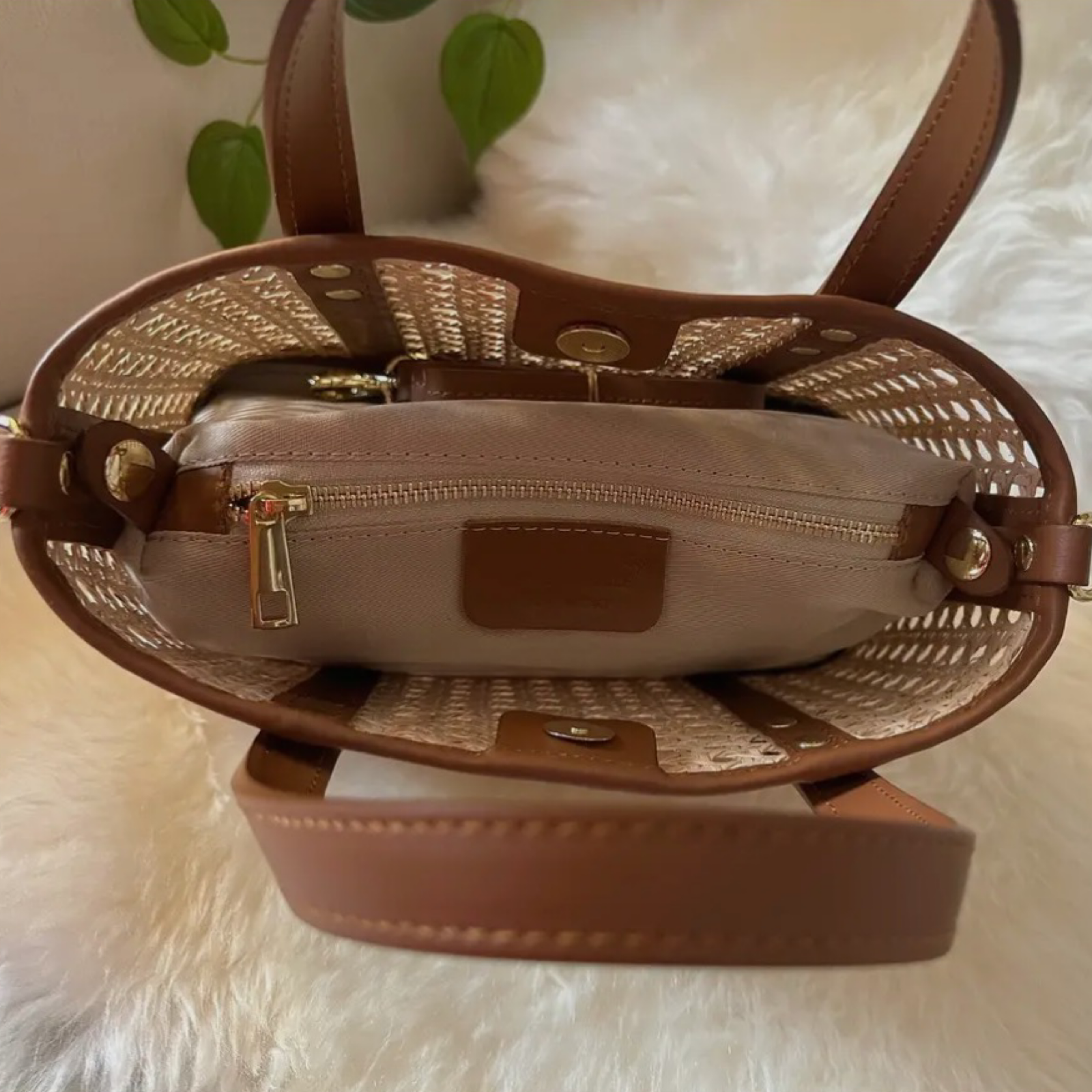 Cane and leather bag features detachable leather strap, removable zippered interior pouch, and protective purse feet. Top magnetic closure. Measures 10 x 8 x 4.5“
