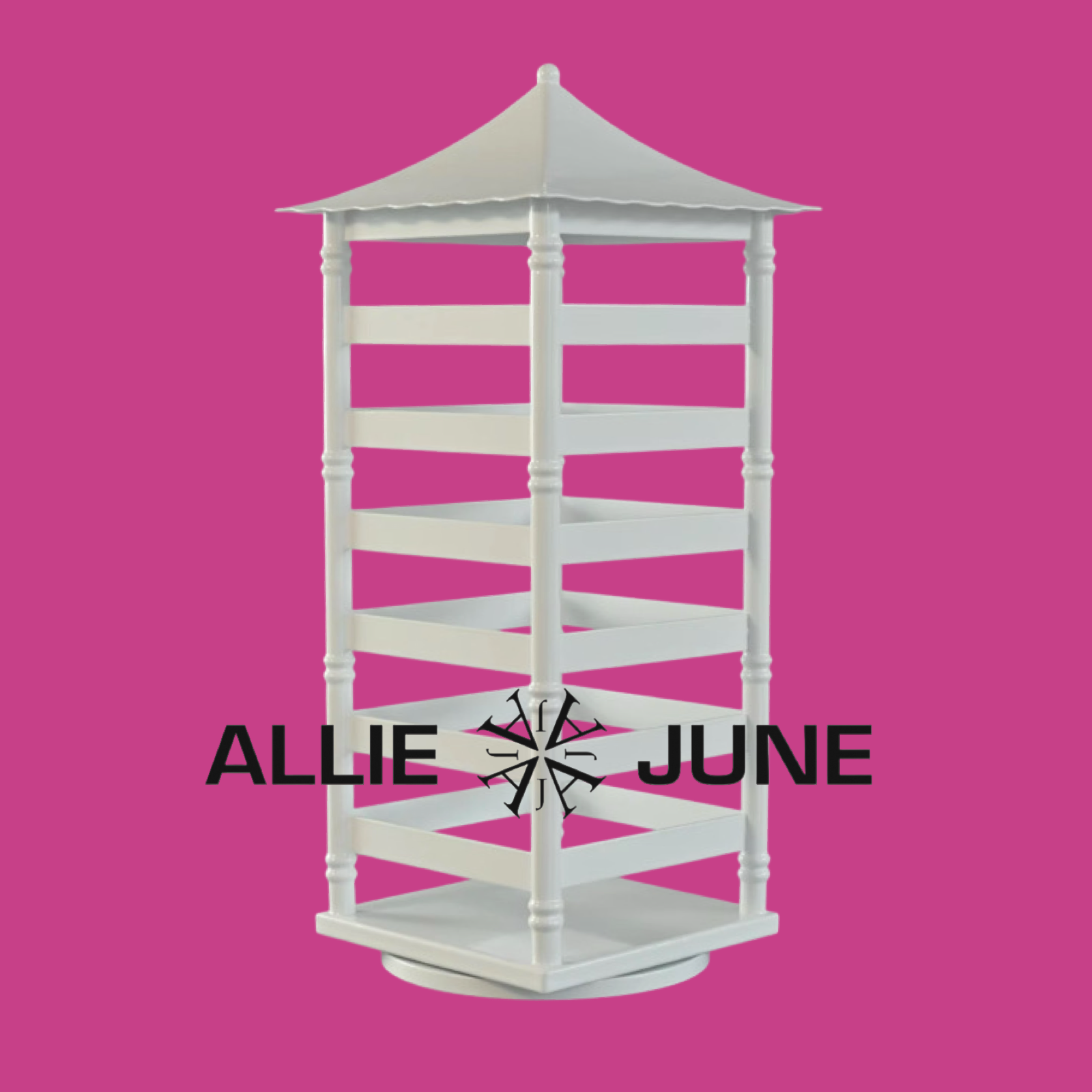 This chinoiserie themed earring display looks equally dreamy in a personal dressing space or boutique. Finished in a white alabaster lacquer, the rotating display features luxe bamboo accents and a scalloped pagoda top. Turntable base. Measures approximately 18.5” x 8” x 8”. An ALLIE JUNE exclusive. Expected ship date 10.15.25.