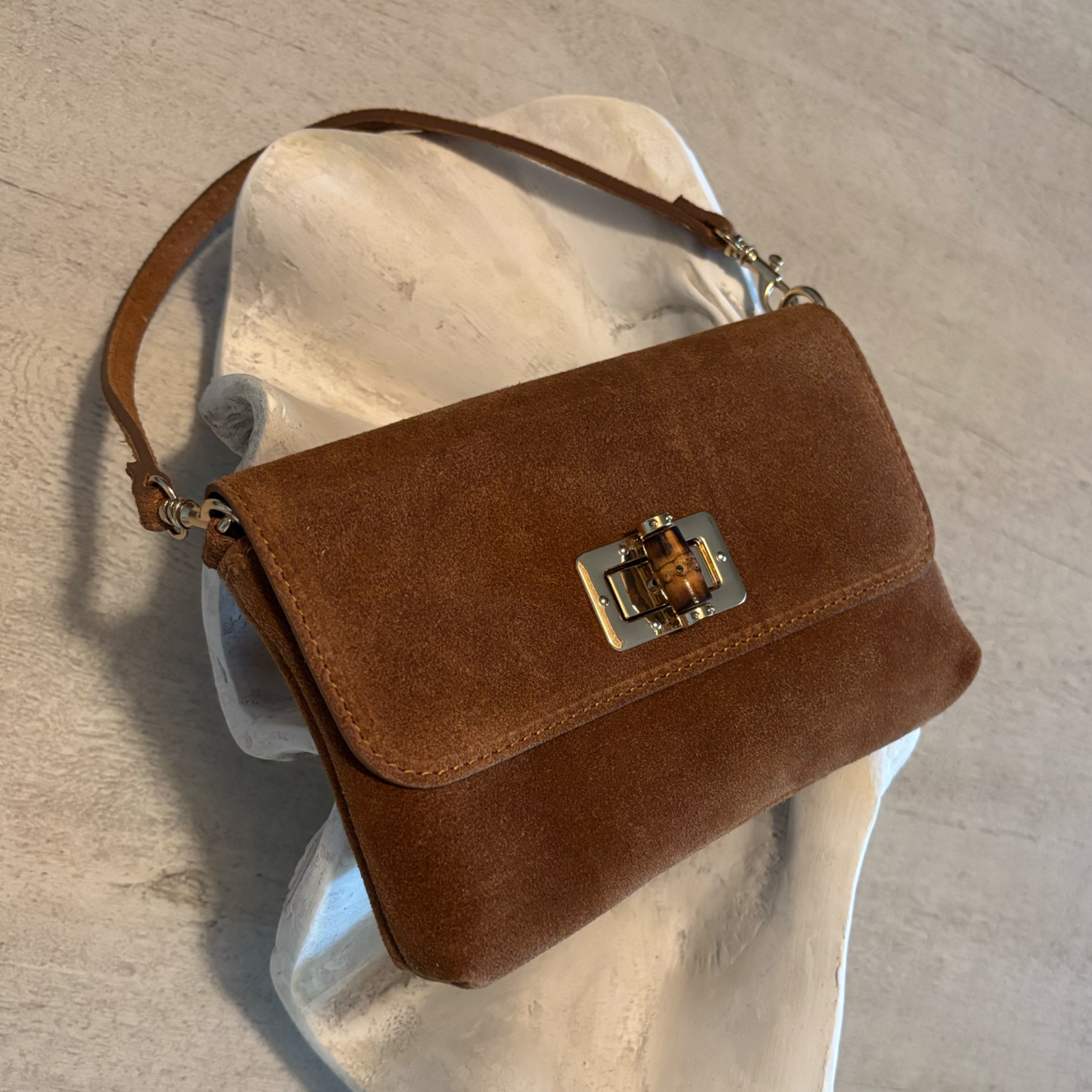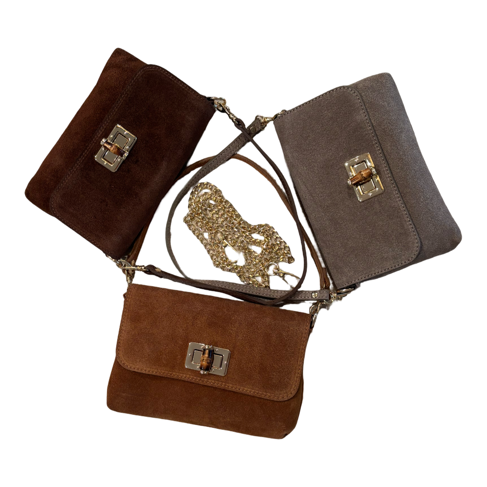 Experience the perfect bag to wear for drinks or a bite to eat. Handcrafted in small batches from buttery soft Italian suede. Includes gold chain. Measures approximately 8” x 5” x 1.3”.