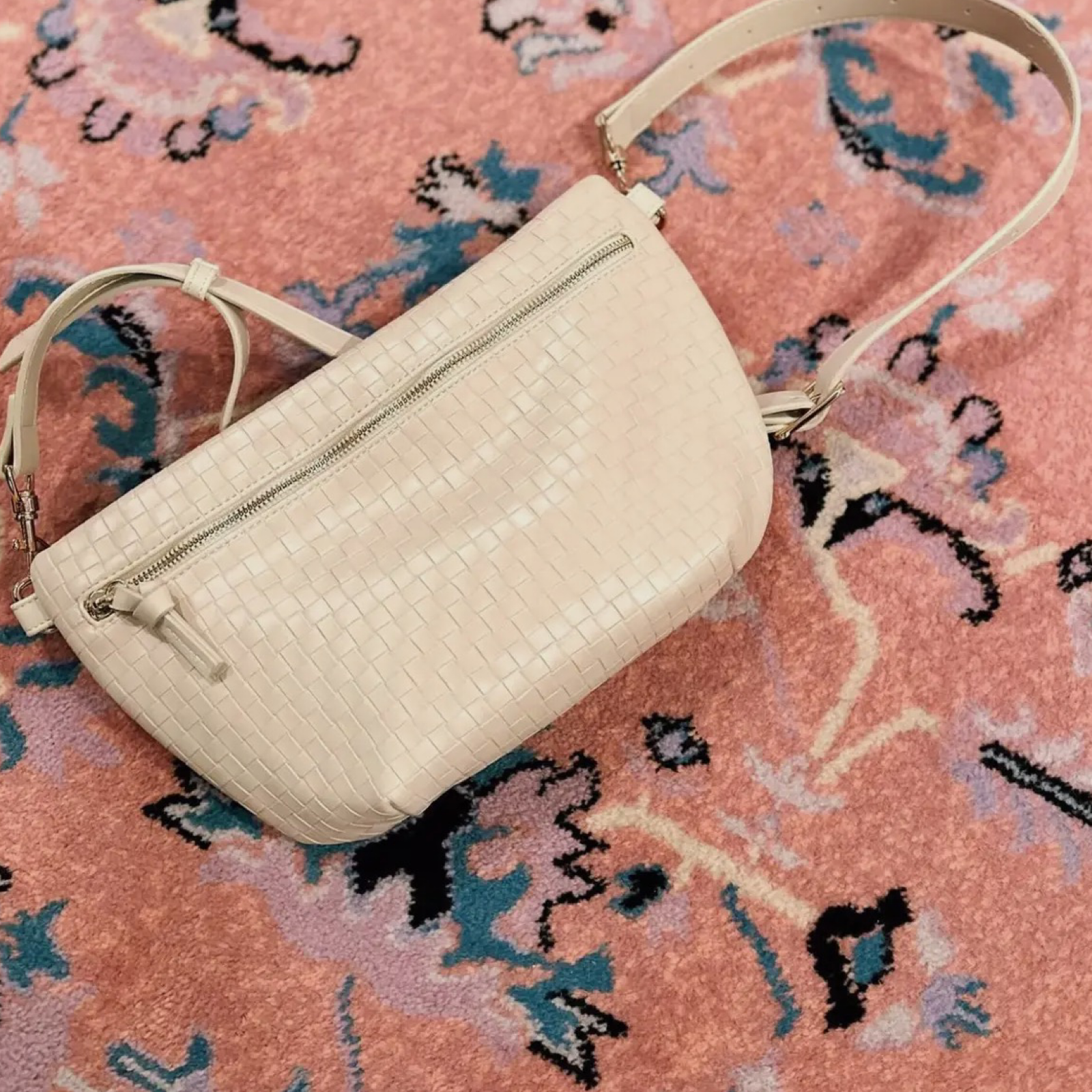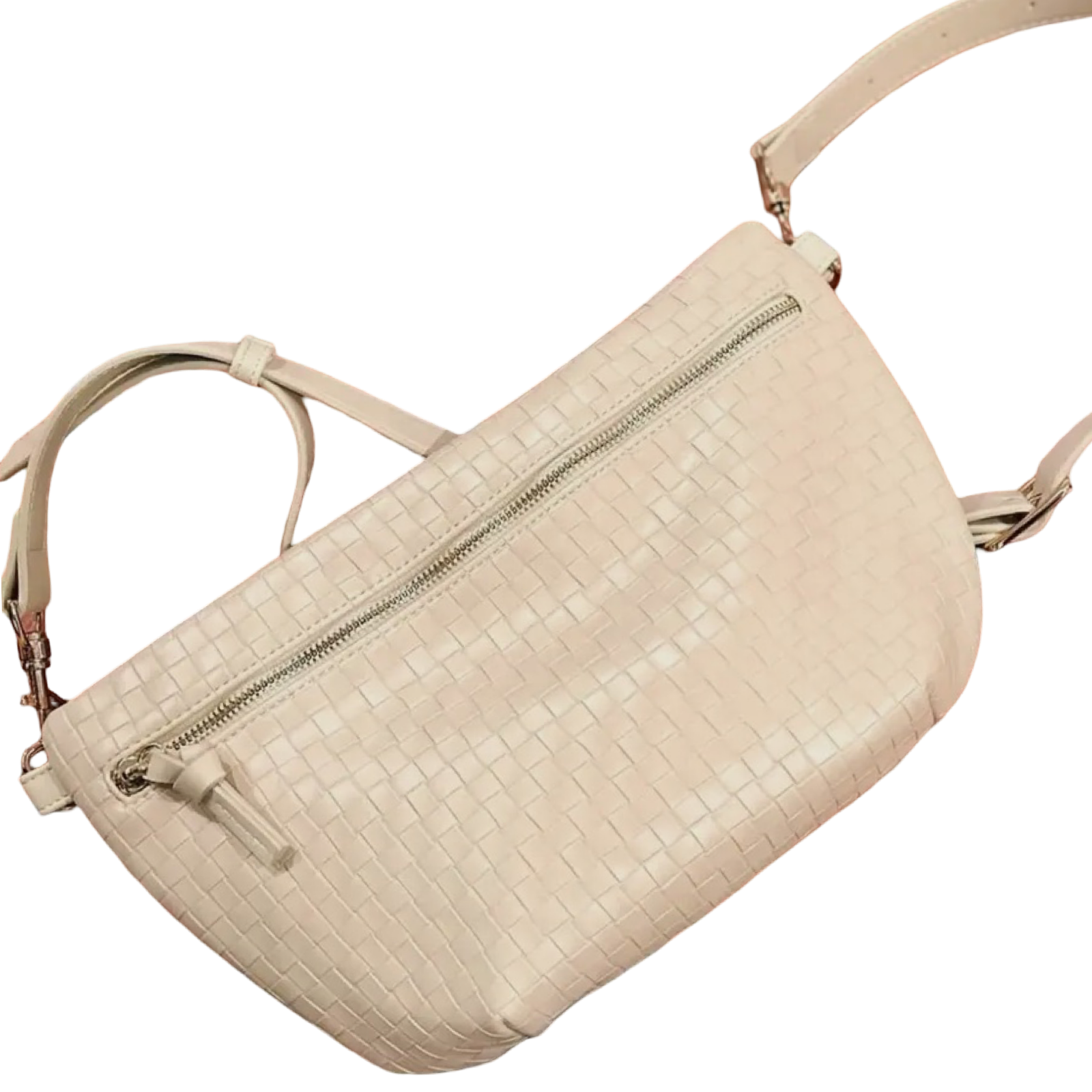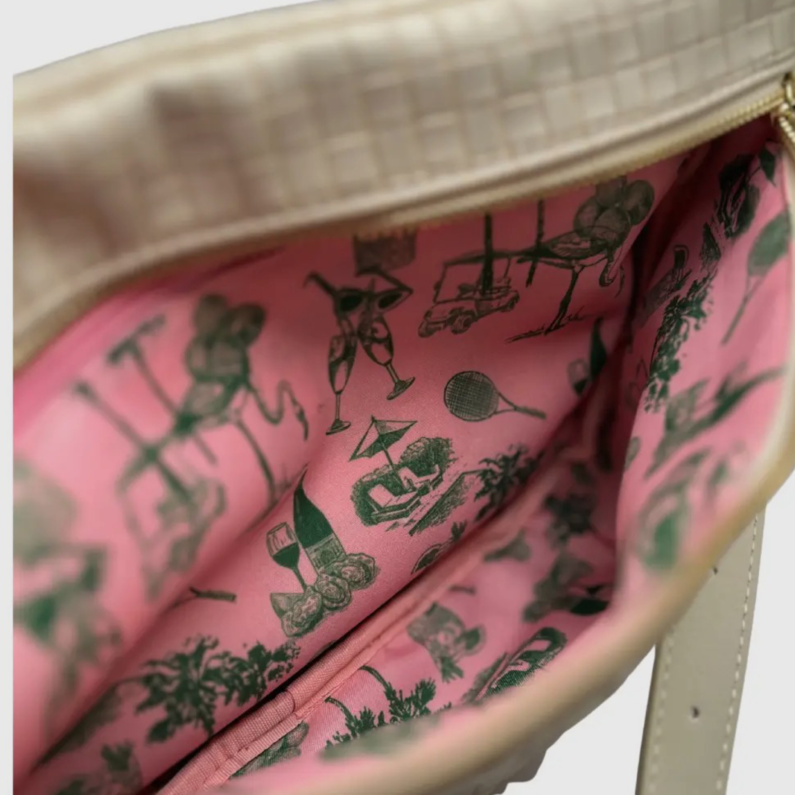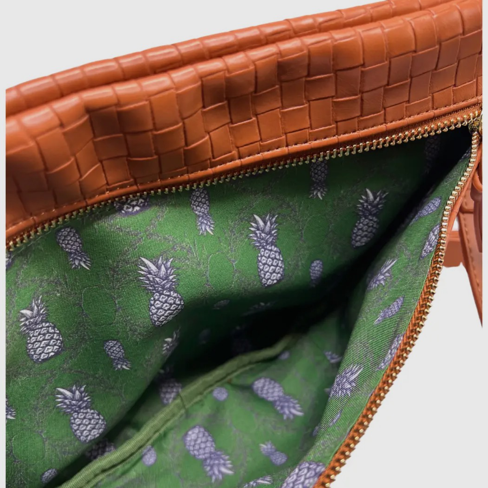 Vegan woven leather sling bag with signature print lining. 12” x 8”.